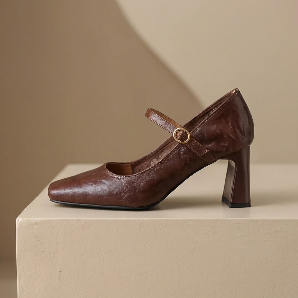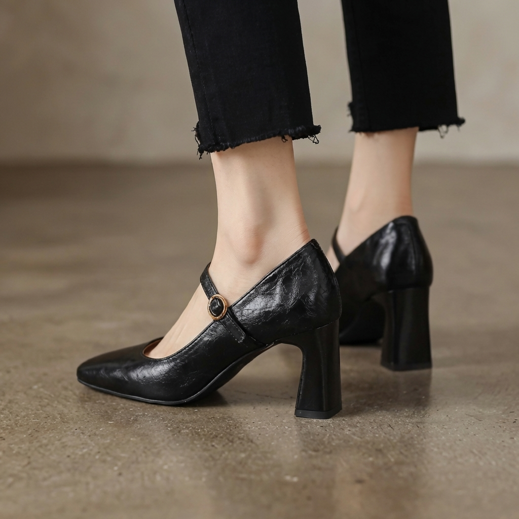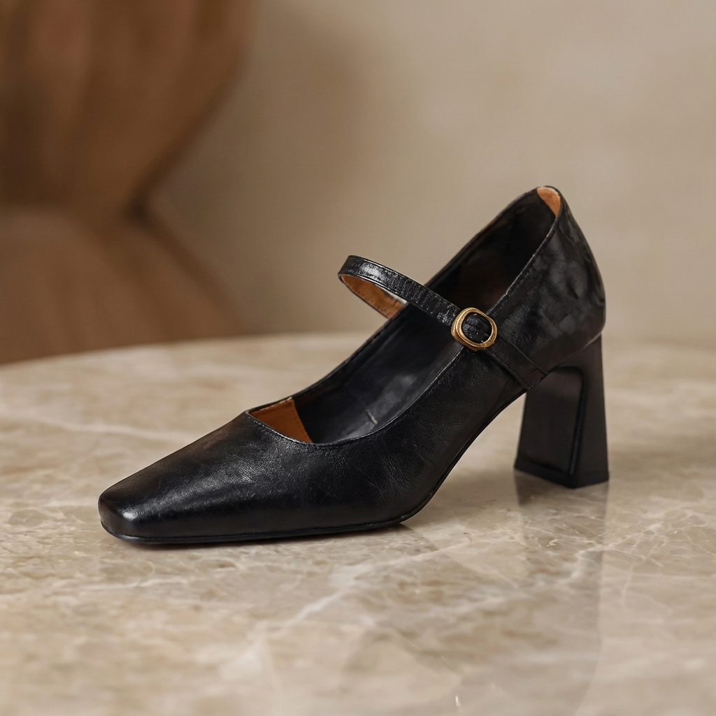 Crafted from premium leather, these heels feature a structured square toe and an elegant strap detail that adds a refined, feminine touch. The sturdy block heel provides stability, while the cushioned footbed ensures lasting comfort throughout the day.